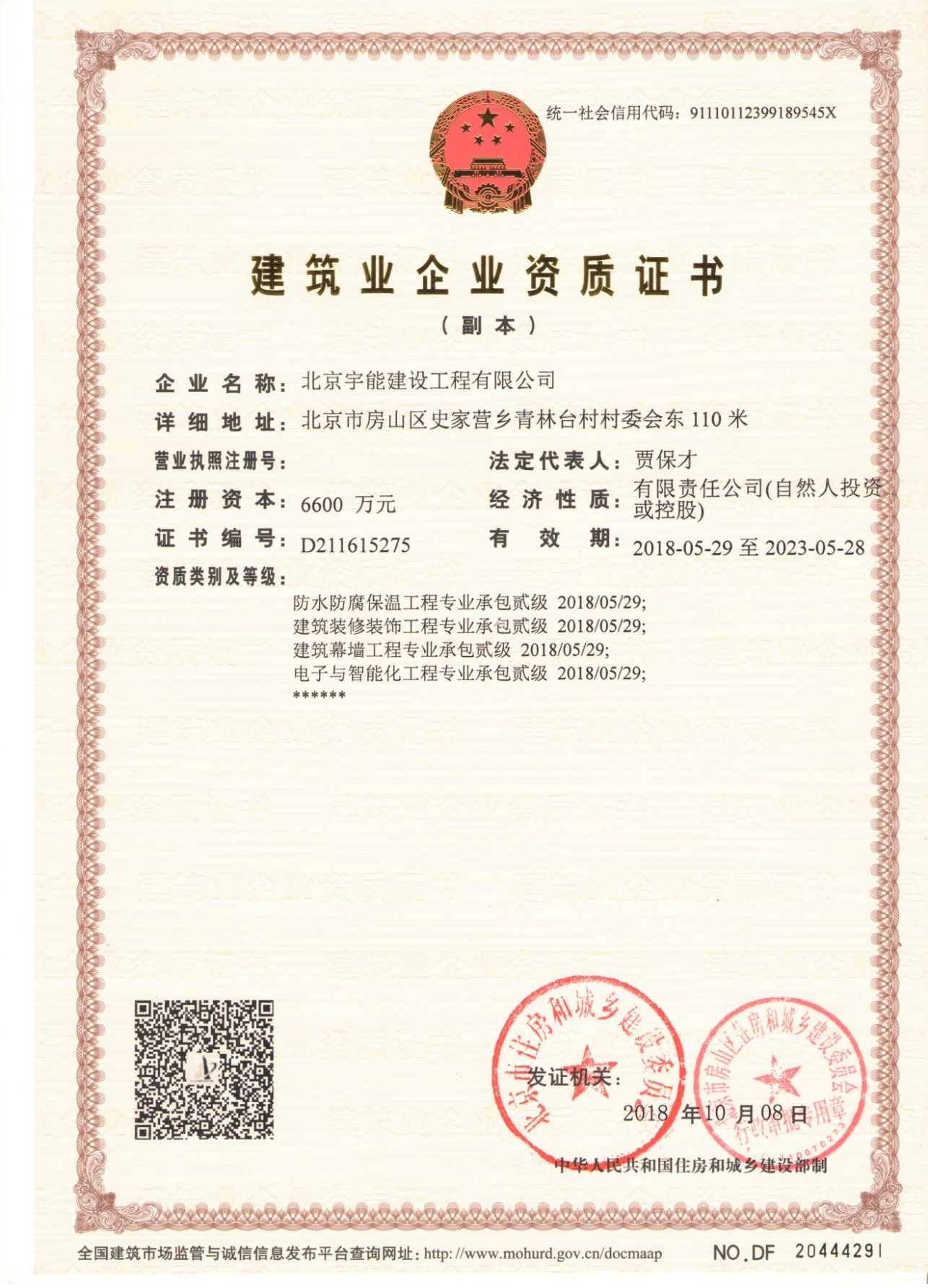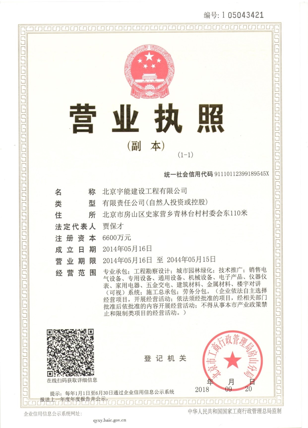 北京宇能建設(shè)工程有限公司成立于2014年5月16日,前身是北京博遠(yuǎn)天宇電力科技有限公司,注冊(cè)資金6600萬元。具有《市政公用工程施工總承包叁級(jí)》、《機(jī)電工程施工總承包叁級(jí)》、《建筑工程施工總承包叁級(jí)》、《建筑裝修裝飾工程專業(yè)承包貳級(jí)》、《電子與智能化工程專業(yè)承包貳級(jí)》、《鋼結(jié)構(gòu)工程專業(yè)承包叁級(jí)》、《防水防腐保溫工程專業(yè)承包貳級(jí)》、《建筑幕墻工程專業(yè)承包貳級(jí)》、《模板腳手架資質(zhì)》等;同時(shí)榮獲AAA誠信企業(yè)證書、AAA級(jí)誠信經(jīng)營示范單位、AAA重合同守信用企業(yè)證書、AAA級(jí)企業(yè)資信等級(jí)證書。鑒于公司領(lǐng)導(dǎo)的為人誠信,作風(fēng)良好,經(jīng)315全國征信系統(tǒng)誠信企業(yè)認(rèn)證中心頒發(fā)誠信企業(yè)家榮譽(yù)證書及誠信經(jīng)理人的榮譽(yù)稱號(hào)。